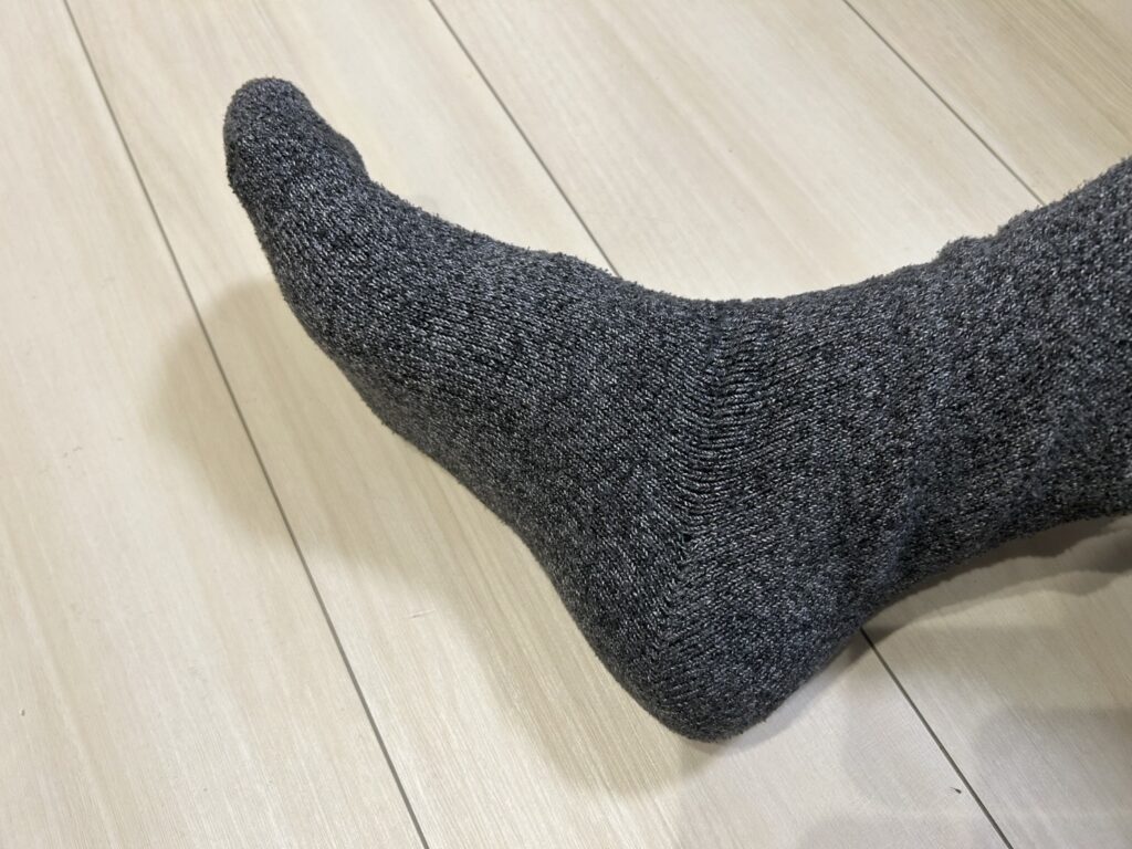 履いてみると柔らかめの素材なので厚めの割に動きやすいですし、足が包まれているような感じでじんわりと暖かみを感じます。