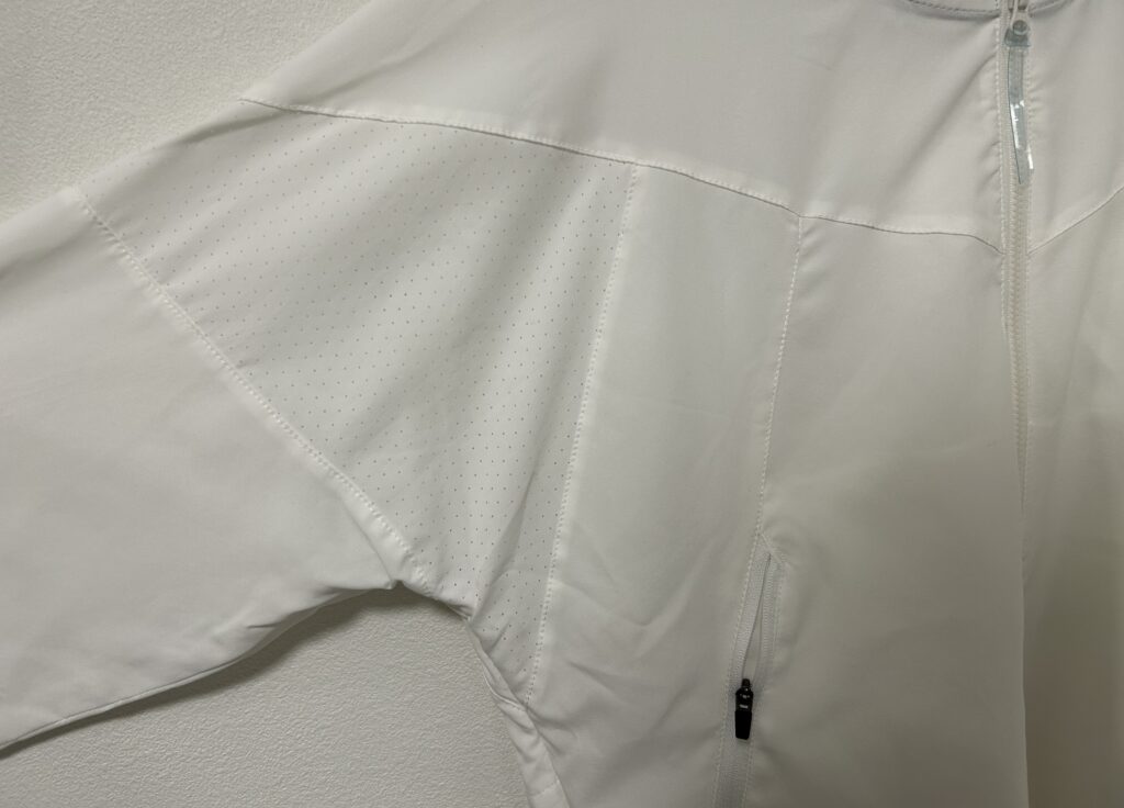 そしてXShelter暑熱αフーディは蒸れた空気を外に逃がす仕組みがてんこ盛りで、汗をかきやすい脇の部分はメッシュ生地が使用されていますし