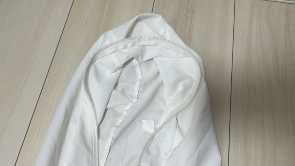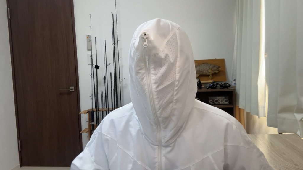 また肌を露出させないことで体への負担を減らしてくれるアイテムなのですが、フードの部分は頭の先までチャックがあって